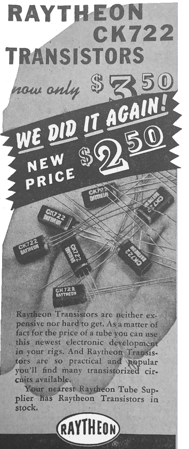 I've always considered myself lucky on being a teenager at the dawn of Rock & Roll. More importantly at the same time the Transistor came along, That was in the mid 50’s. Until then, the work horse of all things electronics was the Vacuum tube. In the beginning they were fist size eventually becoming thumb size like the popular 6AU6 used in just about all table top radios. They were made of glass and had a light bulb type filament inside to excite the electrons within. And they did get hot. They needed both low AC voltage for the filament and high DC voltage for the anode and cathode to function. It was during the mid 50’s, Bell Labs developed the first transistors at a fraction of the size of a vacuum tube - about the size of an eraser on a pencil. They required no AC, just low voltage DC - a couple of 1.5 volt flash light batteries would do. And they produced no detectable heat. Do you remember your first Transistor Radio? It often would say "Six Transistors", and if you were really cool, it could have even been an Eight Transistor. The first transistor radio was the Regency TR1 (left). It was dubbed as the WORLDS FIRST POCKET RADIO. You may have had the one shown here. It even came in over a half a dozen colors. Its price - $49.95 About the same time, the first transistors became available for hobbyists. They were the Raytheon CK722, followed by the GE 2N107. An ad in the July 1955 Popular Electronics lists them for $2.50 about the price of a vacuum tube.
